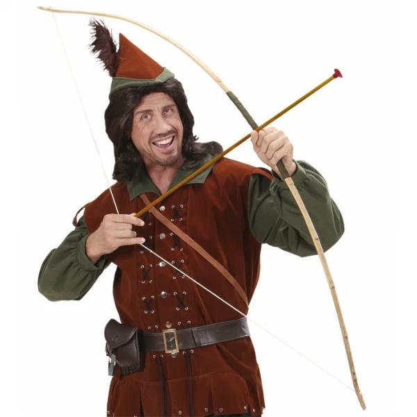 Arco in legno comprensivo di faretra in TNT (tessuto non tessuto) con tre frecce di plastica. Dimensioni: altezza arco centimetri 150.