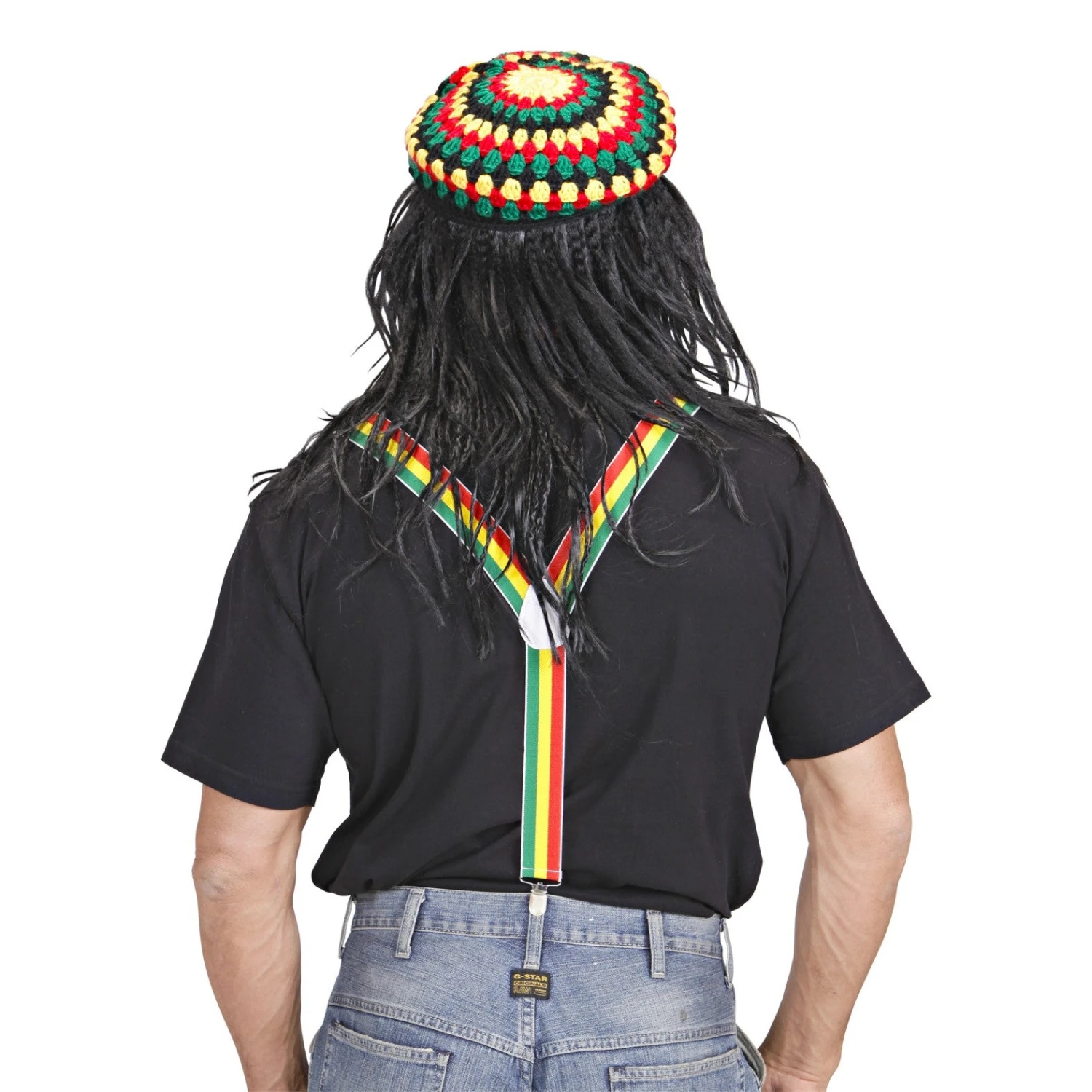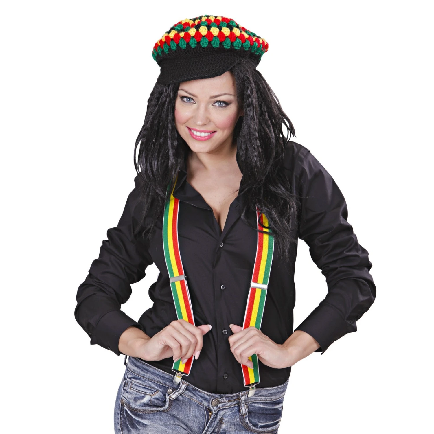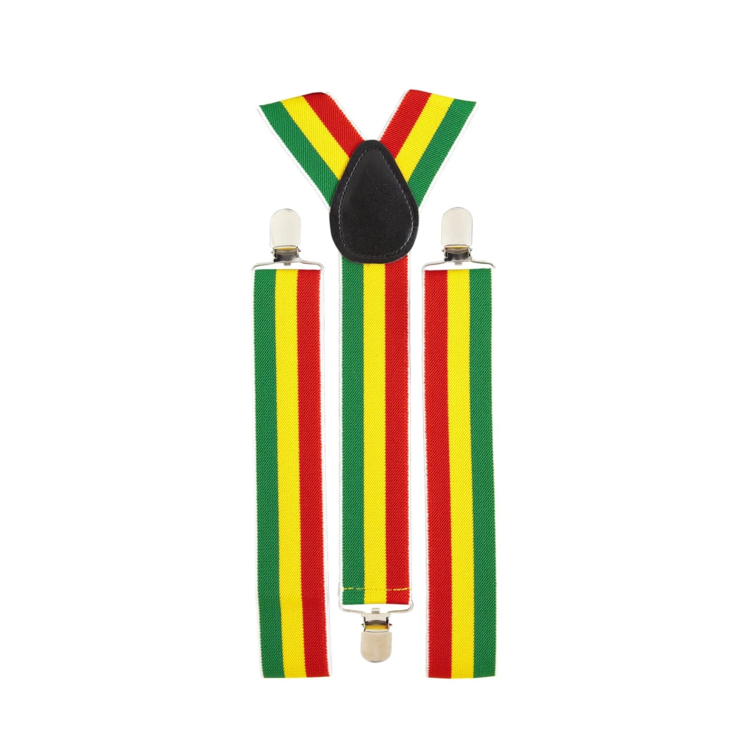 Sentiti anche tu un rastafariano con queste coloratissime bretelle da indossare con i colori della bandiera della Giamaica. Elastiche e in misura unica.