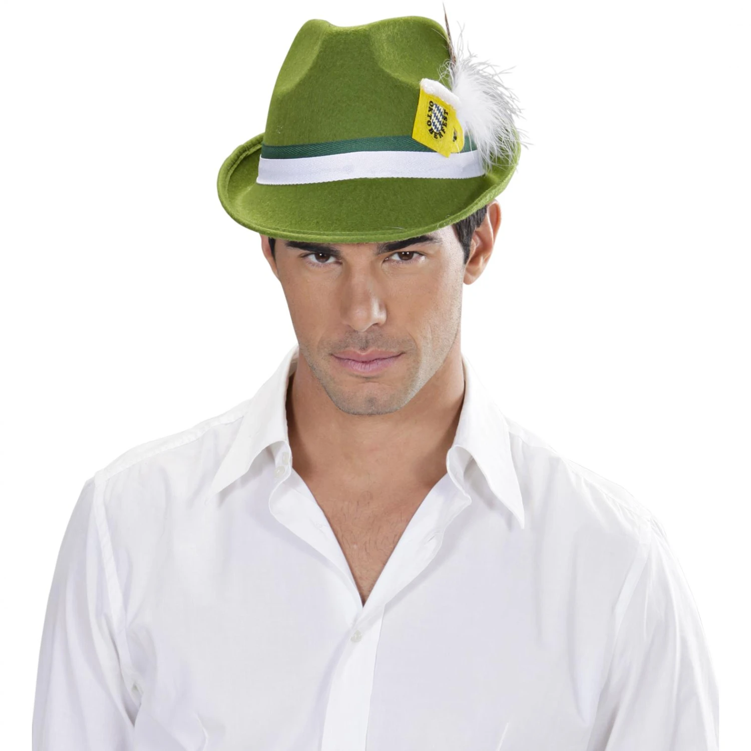 Tipico cappello bavarese di colore verde, con decorazioni di piuma e boccale di birra da abbinare a tutti i costumi a tema Oktoberfest in vendita sul nostro store.