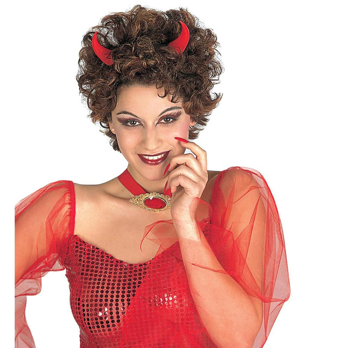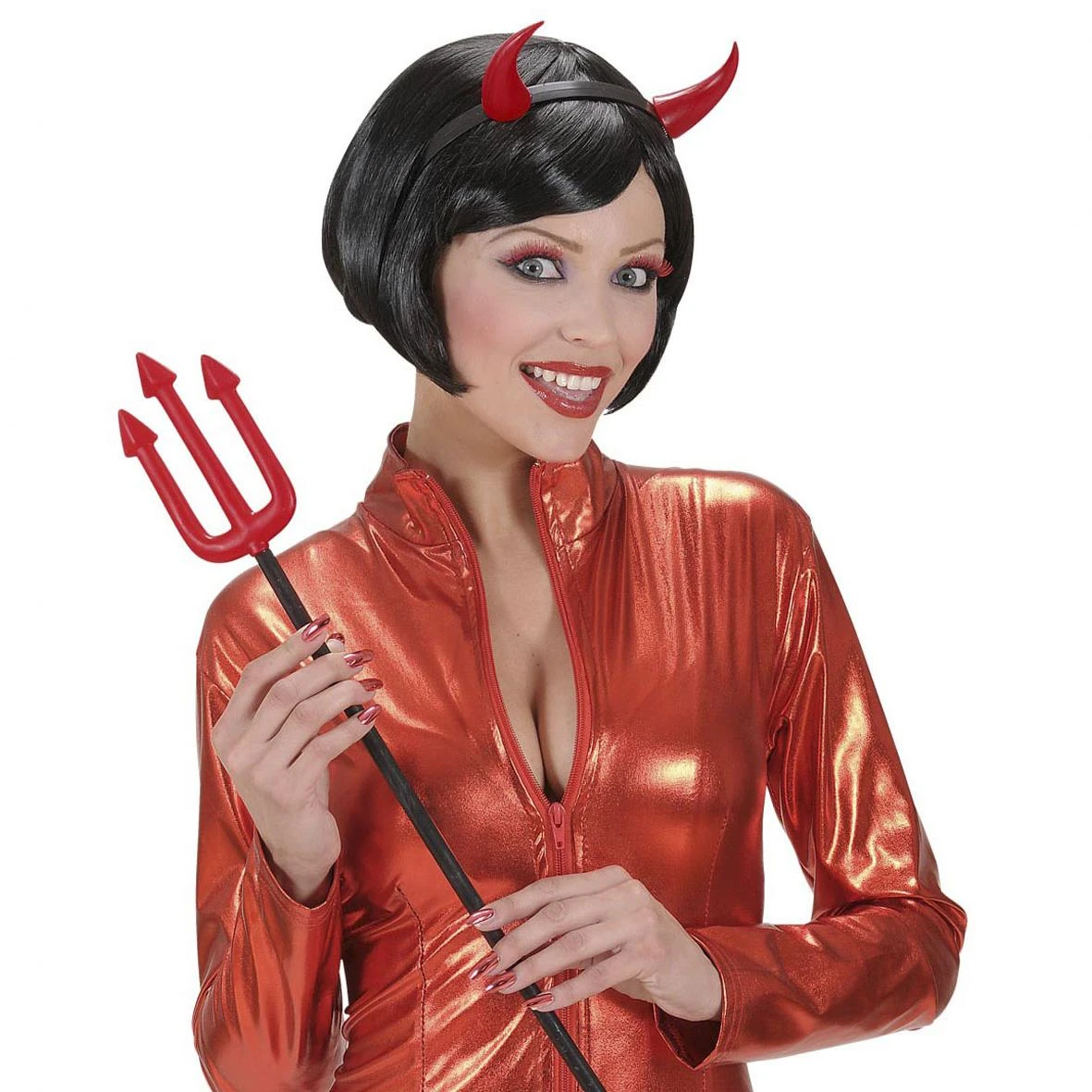 Cerchietto con corna da diavolo rosse, tutto realizzato in plastica. La base del cerchietto è di colore nero.Lunghezza CM 19 x CM 17, taglia unica. Un classico tra i gadget per la festa di Halloween.