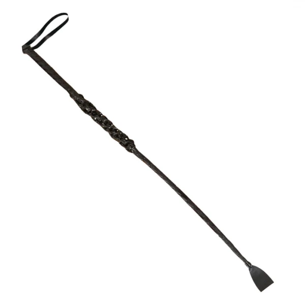 Accessorio fondamentale da cavallerizzo…ma anche da dominatrice sadomaso. Il frustino è completamente realizzato in similpelle ed ha una lunghezza di centimetri 60. Il colore è il nero. Ha un’impugnatura con delle striscie in similpelle intracciate; questo accorgimento serve per avere maggiore presa ed evitare scivolamenti improvvisi della mano. La struttura è di plastica ricoperta con uno strato di similpelle.