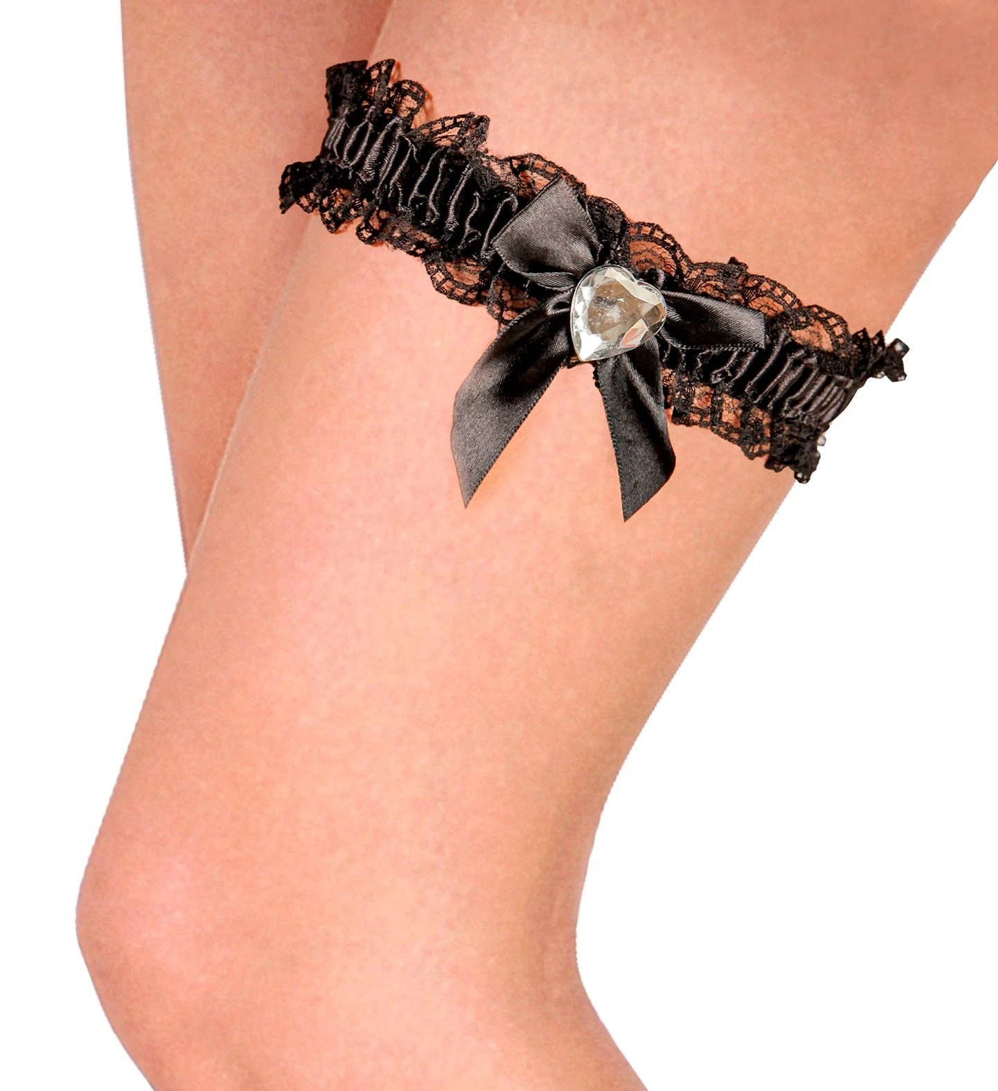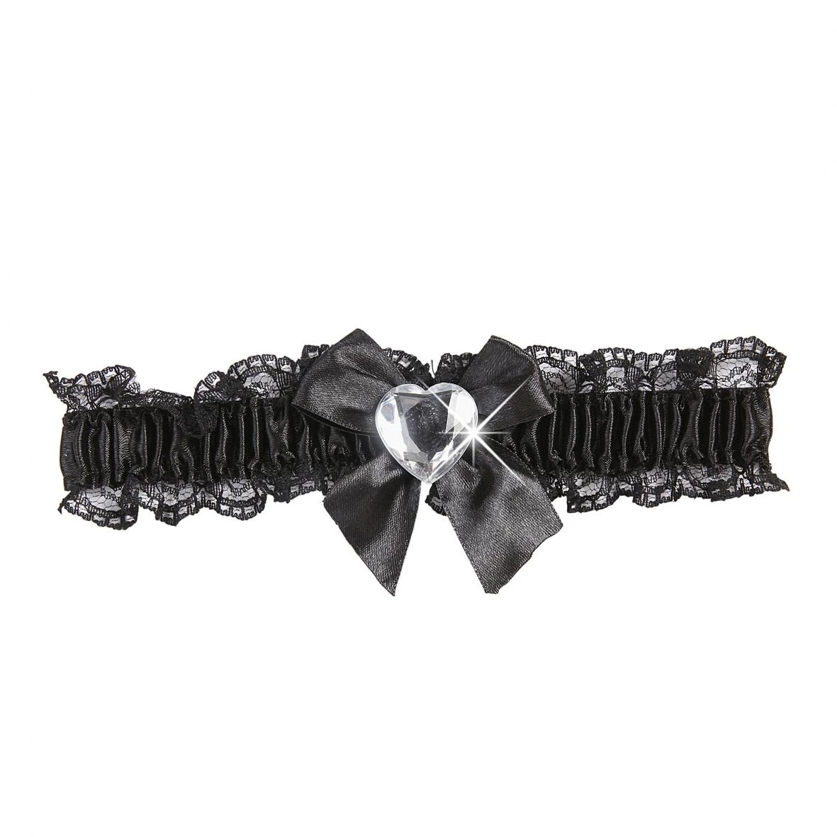 Questo articolo puo’ essere indossato sia come se fosse un collarino o una giarrettiera. Completamente reallizata in tessuto di colore nero e arricchita con un cuore traparente, come un diamante.