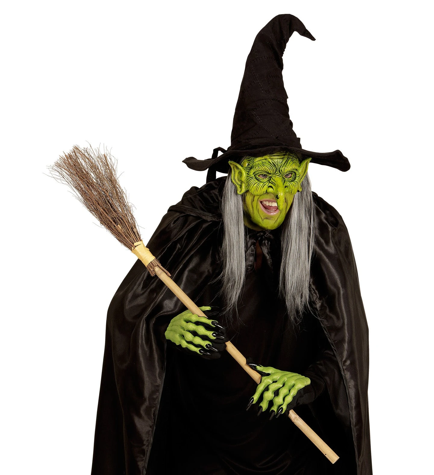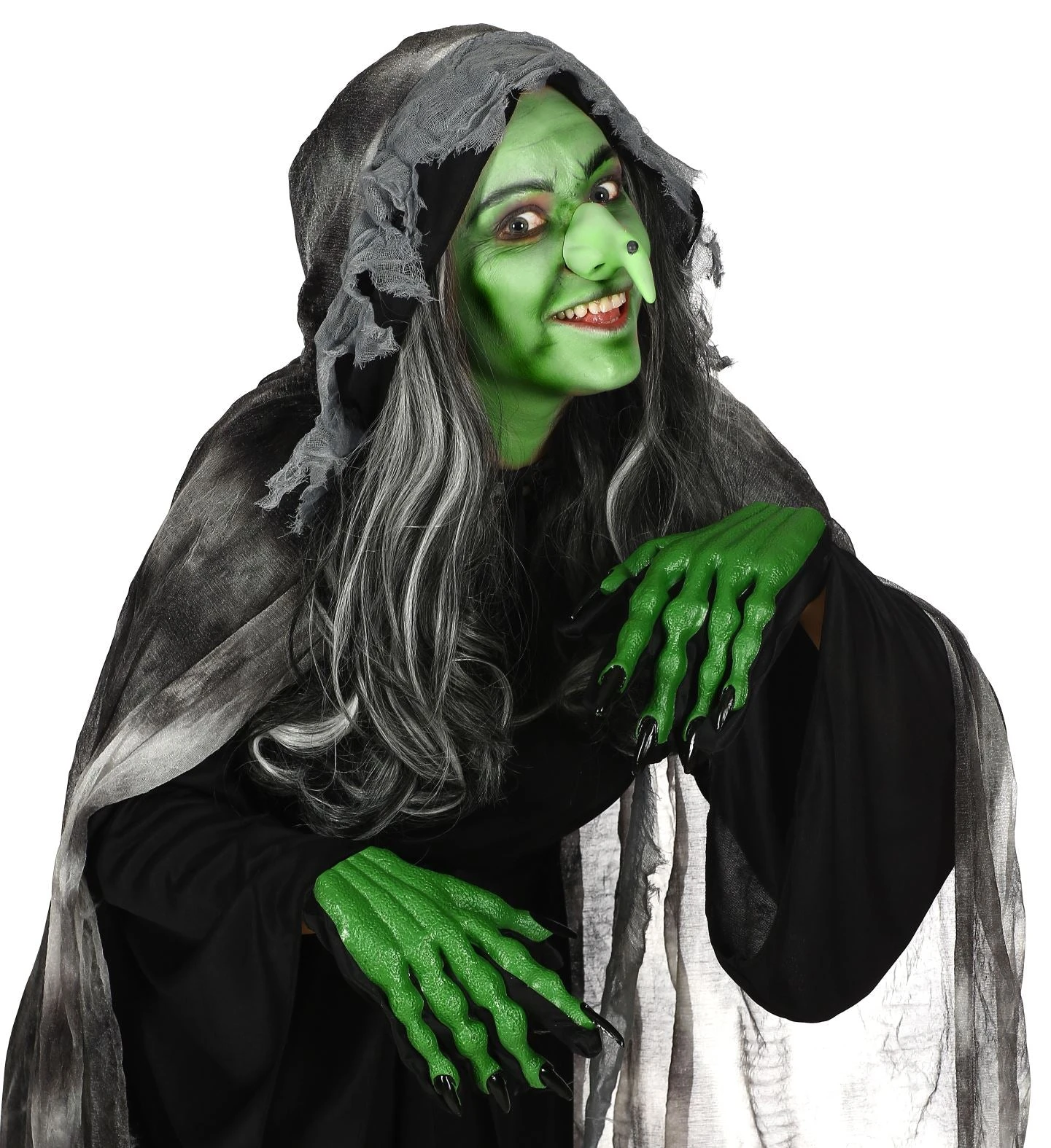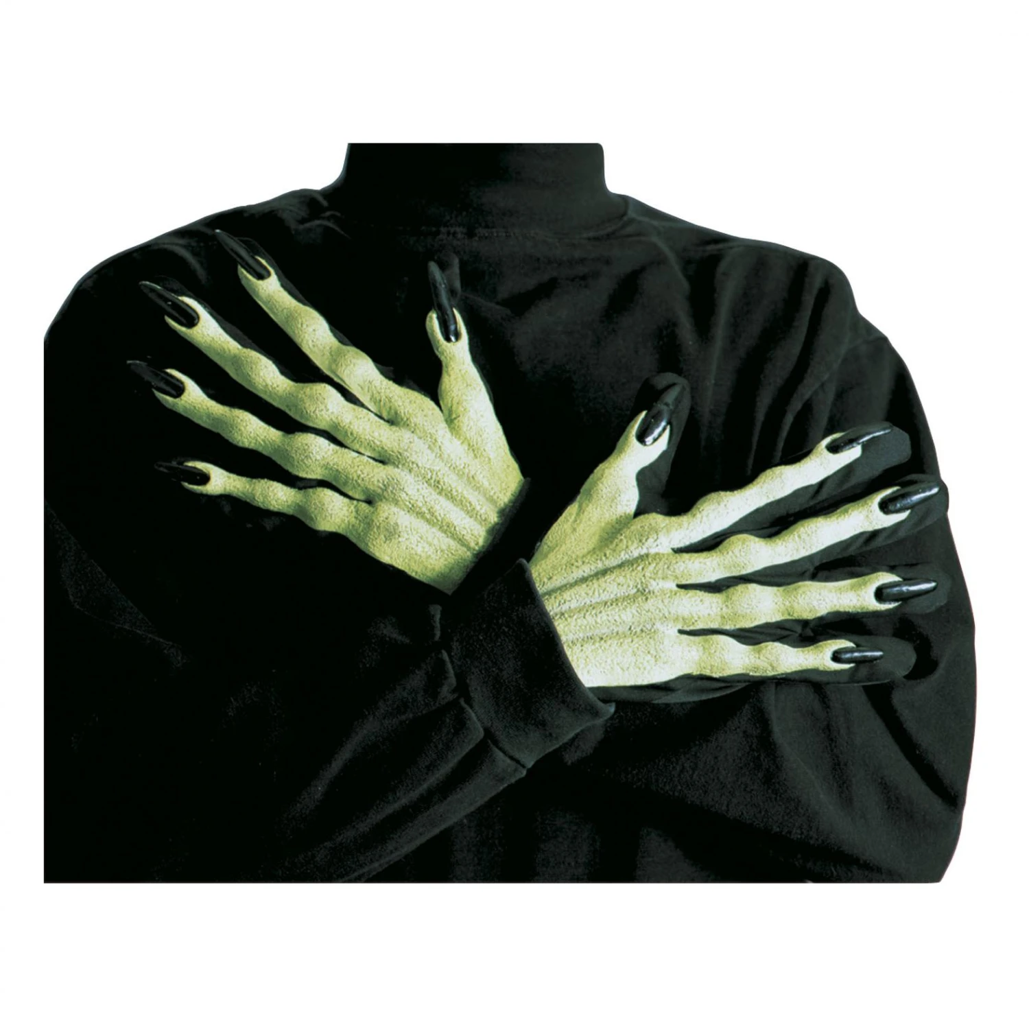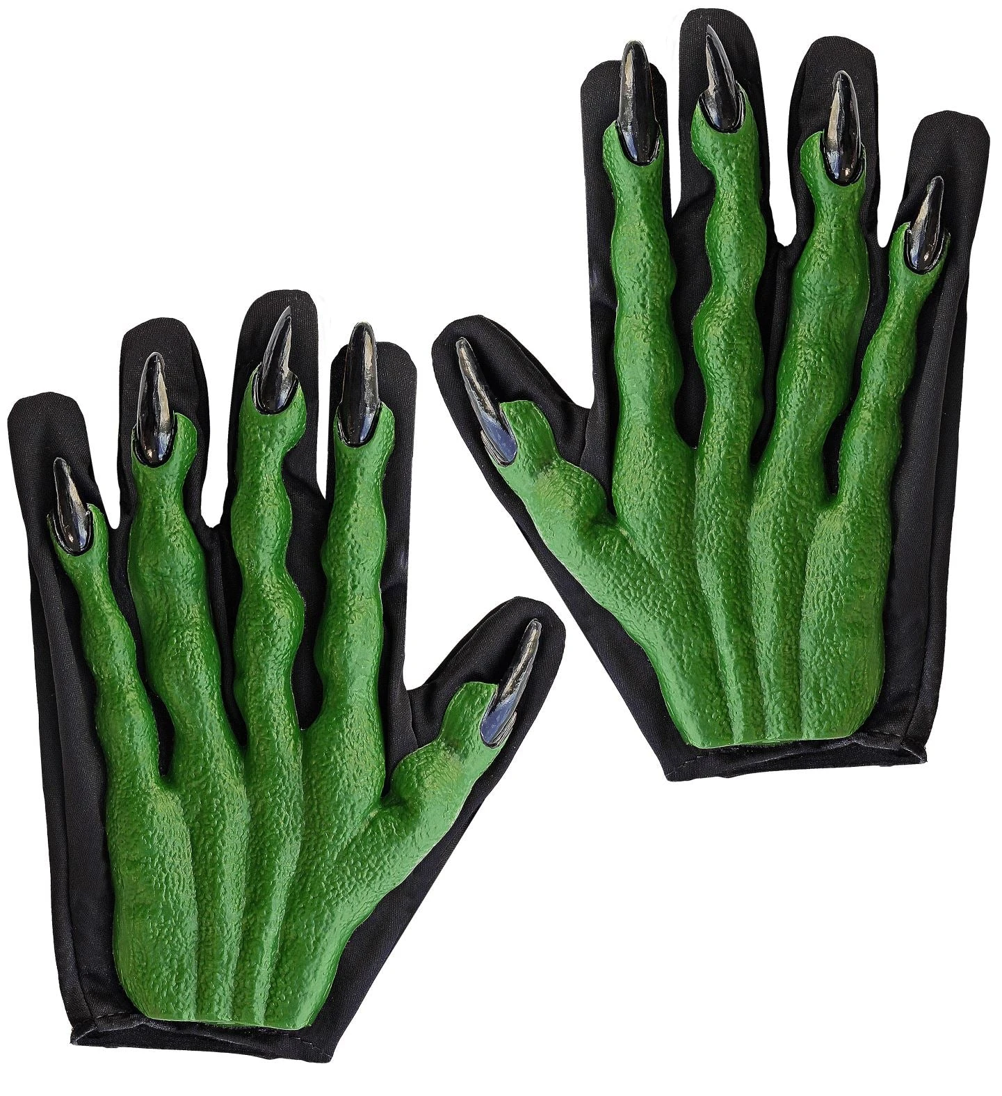 GUANTI STREGA IN TESSUTO NERO SORMONTATO DA STRUTTURA OSSEA IN LATTICE COLORE VERDE FLUORESCENTE. MISURA UNICA, PER ADULTO. LUNGH. CM 23