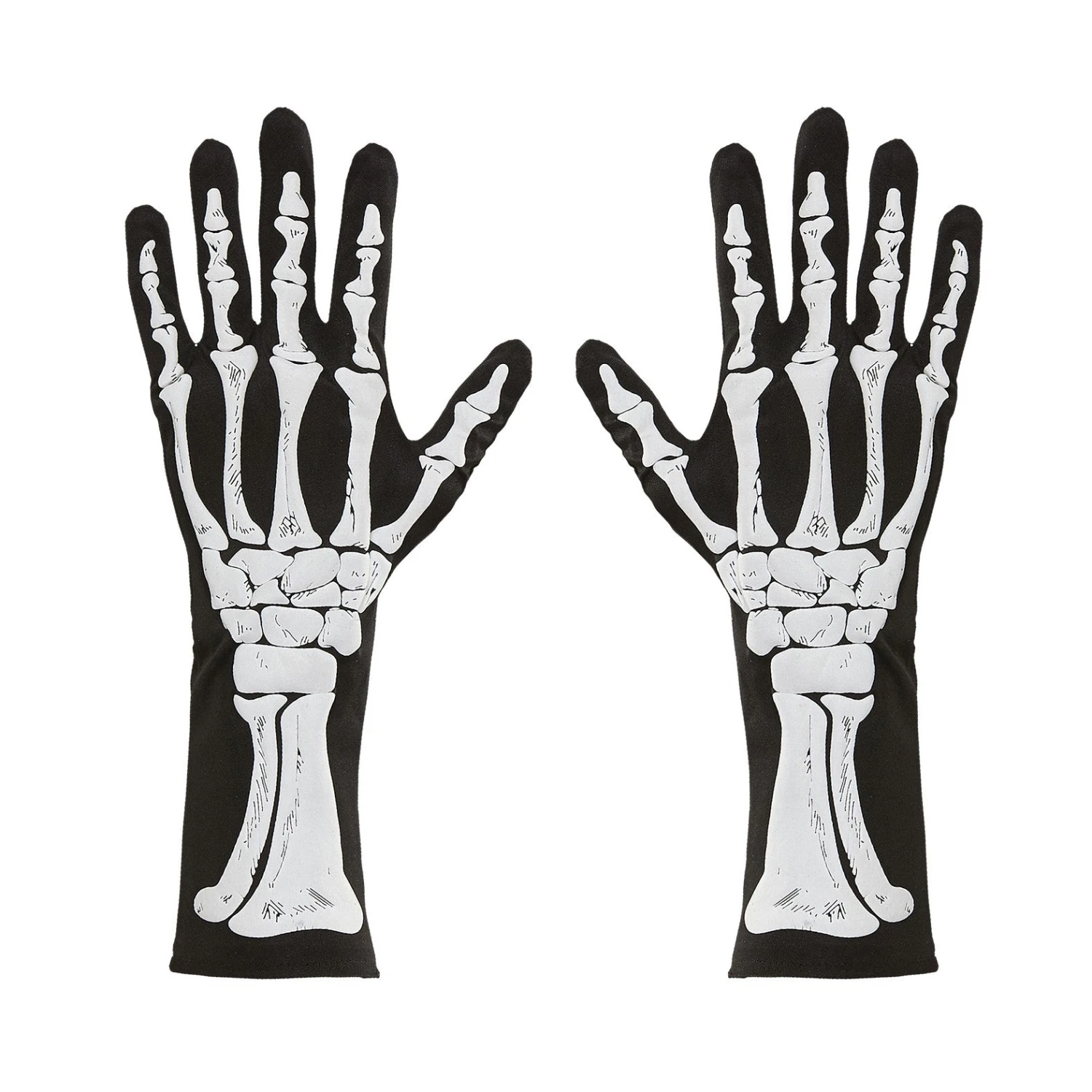 Guanti in tessuto di poliestere con impresse le ossa da scheletro. La lunghezza è di centimetri 35 circa.