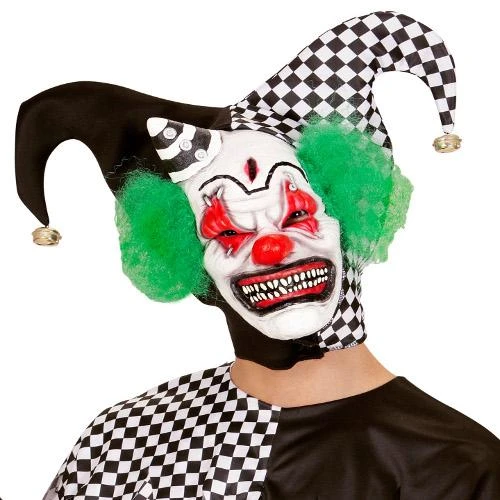 Questa maschera da clown killer copre solo la parte anteriore del viso ed è dotata di elastico per essere sorretta nella parte posteriore. Questo clown killer con sorriso è dotato di capelli verdi ai lati e mini cappellino a cono in testa.