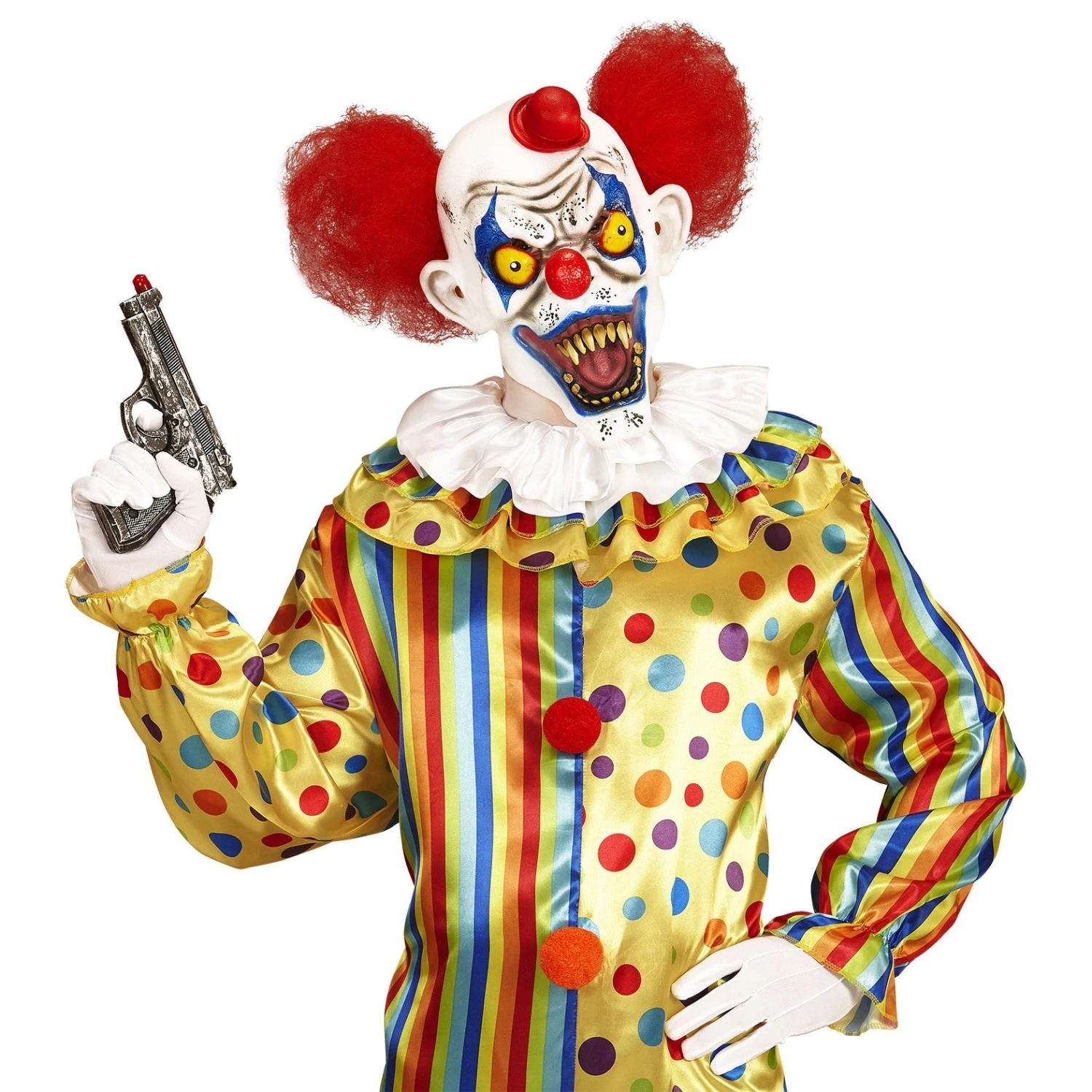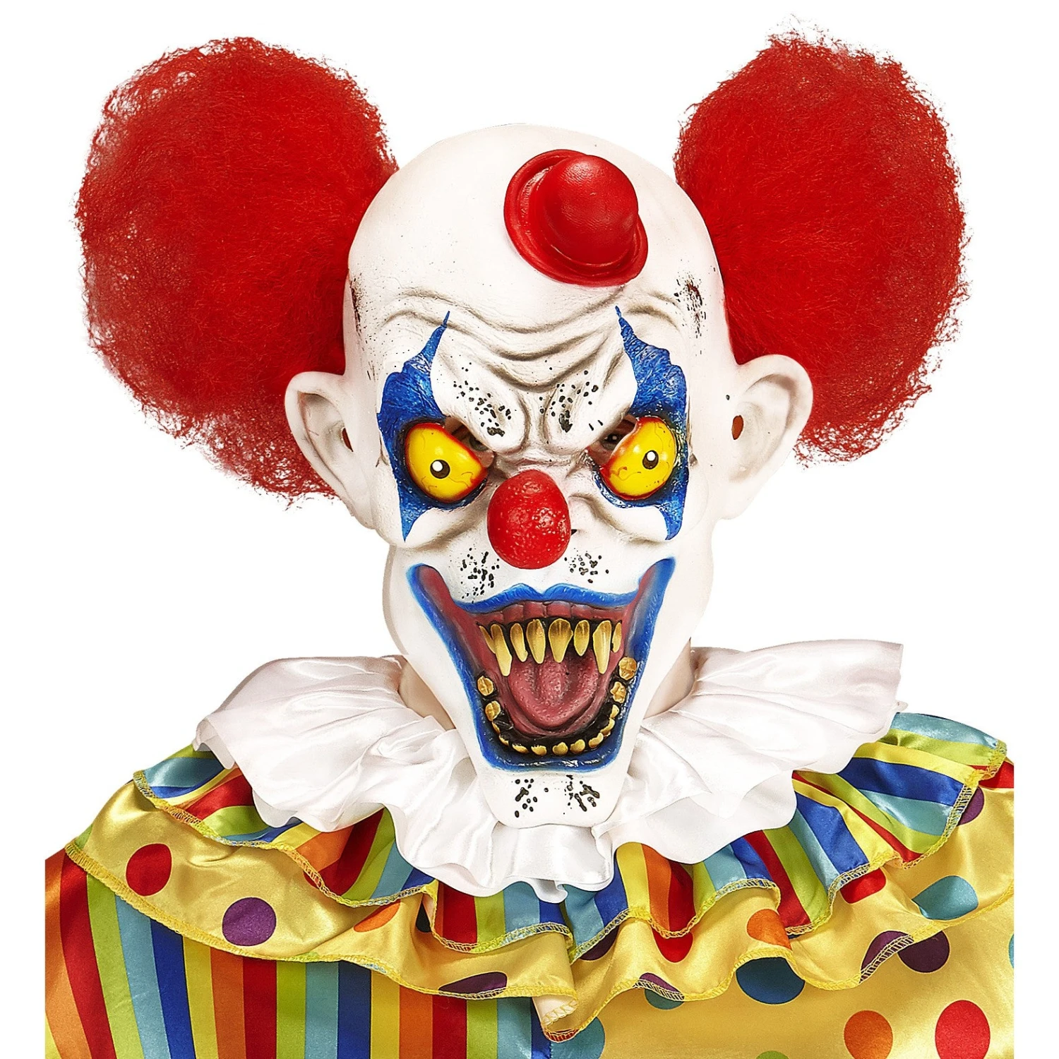 Ricorda da molto vicino la maschera indossata da IT, il capolavoro di King. Con questi denti di colore giallo e putrefatti e la smorfia di cattiveria. E’ il clown assassino e sanguinario. E’ anche molte chic, con quel piccolo cilindro rosso in testa.