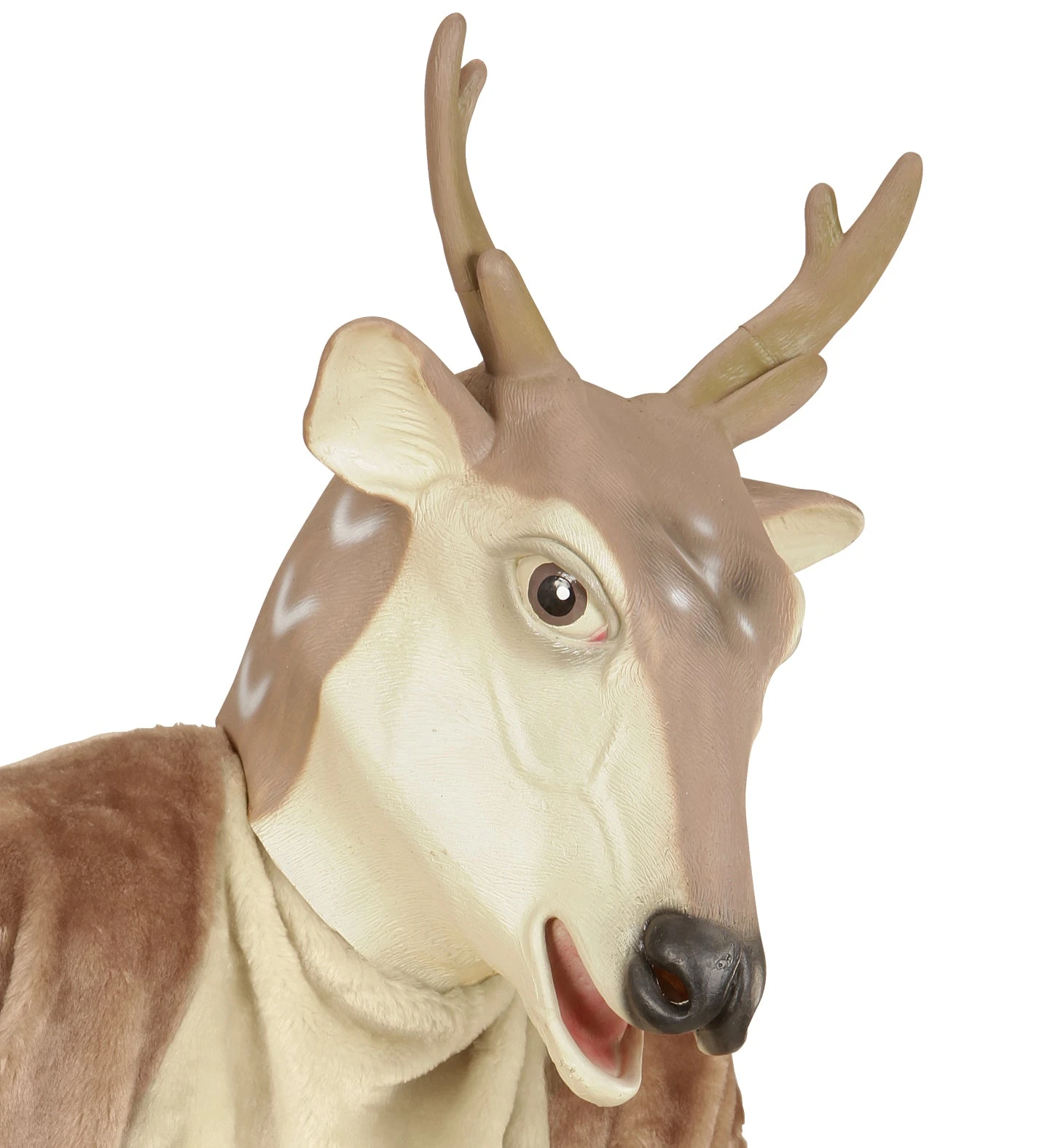 Una nuova maschera si va ad aggiungere al nostro catalogo di maschere di animali: la renna. La maschera è realizzata in lattice e i colori predominanti sono l’avorio e il nocciola. Perfetta riproduzione del muso dell’animale, in quanto sono messi ben in evidenza gli occhi e il muso. Sopra la testa sono presenti le corna. La maschera è in misura da adulto e copre oltre il viso, la nuca.