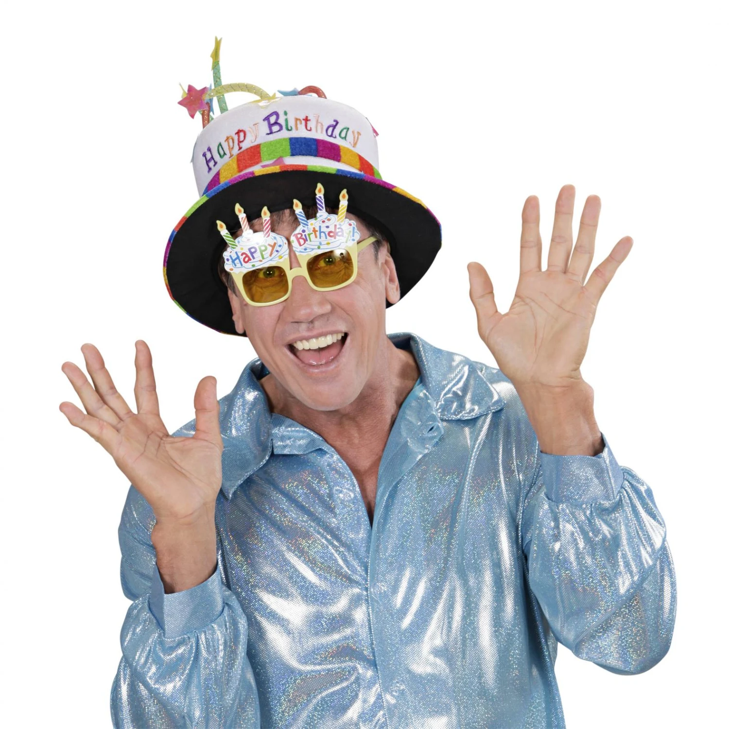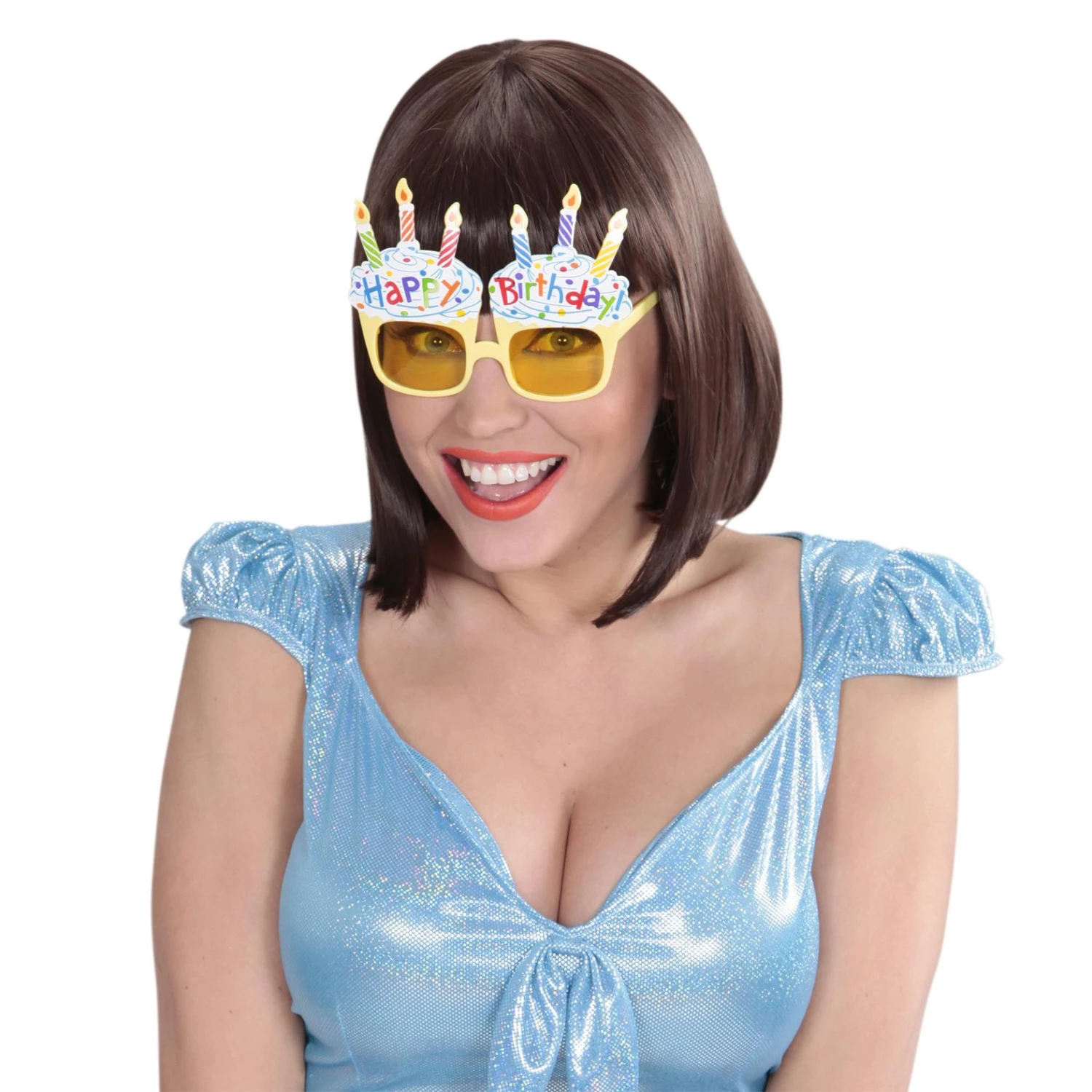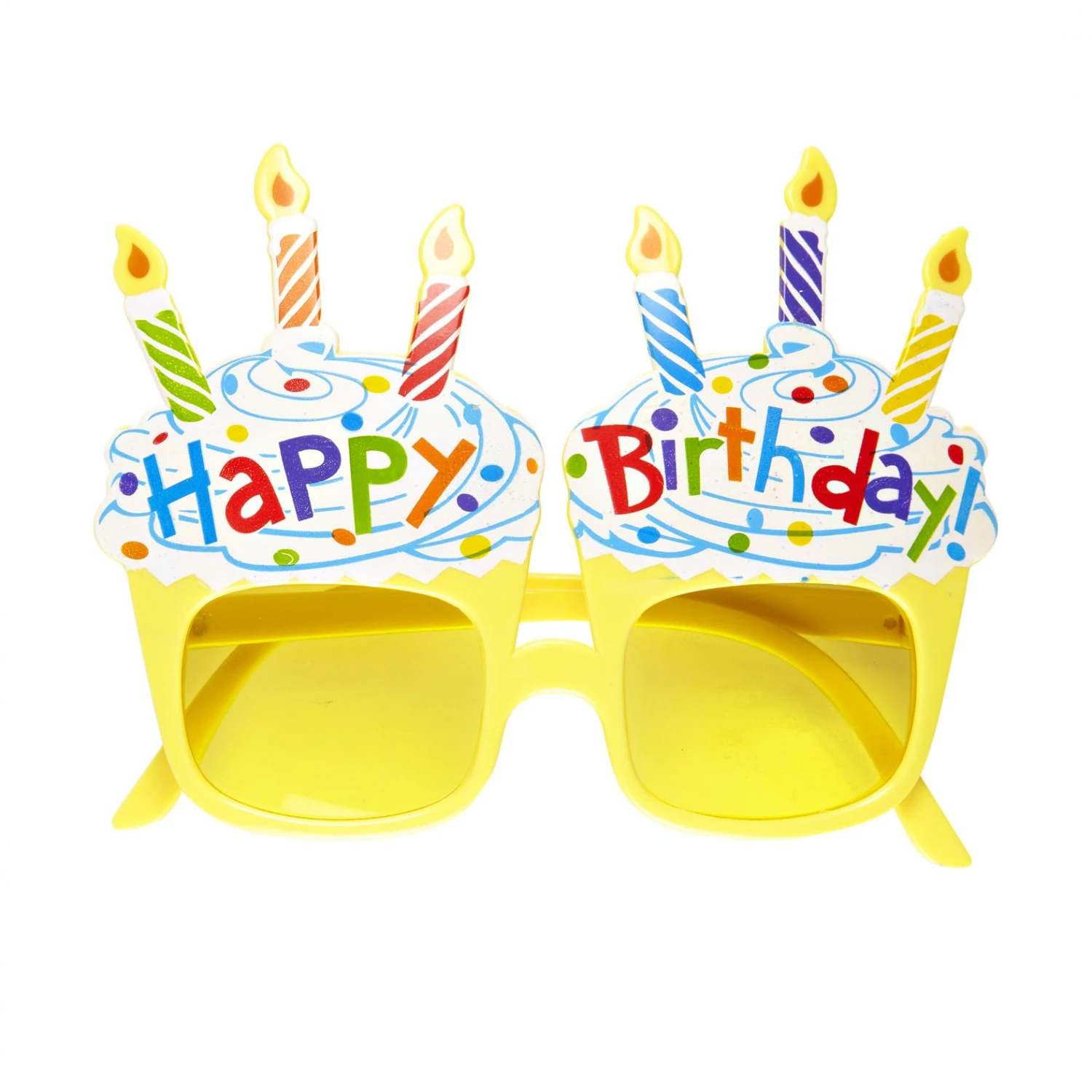 Spiritossissimi occhiali con due torte di compleanno sagomati sulle lenti. Scritta coloratissima Happy Birthday. Struttura in plastica di colore giallo. Festeggia alla grande il tuo compleanno.