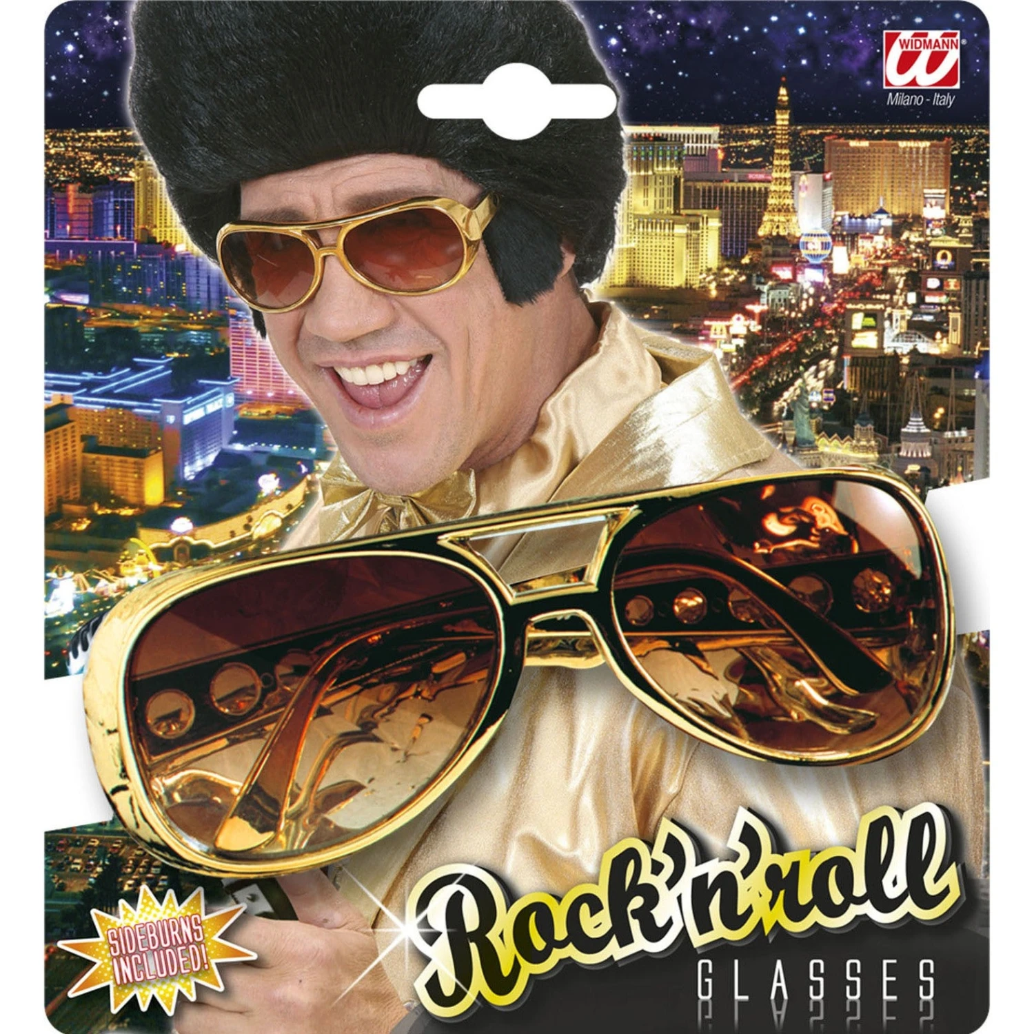Occhiali modello rock’n roll in plastica con basette. Dimensioni: lunghezza centimetri 5 x larghezza centimetri 15.