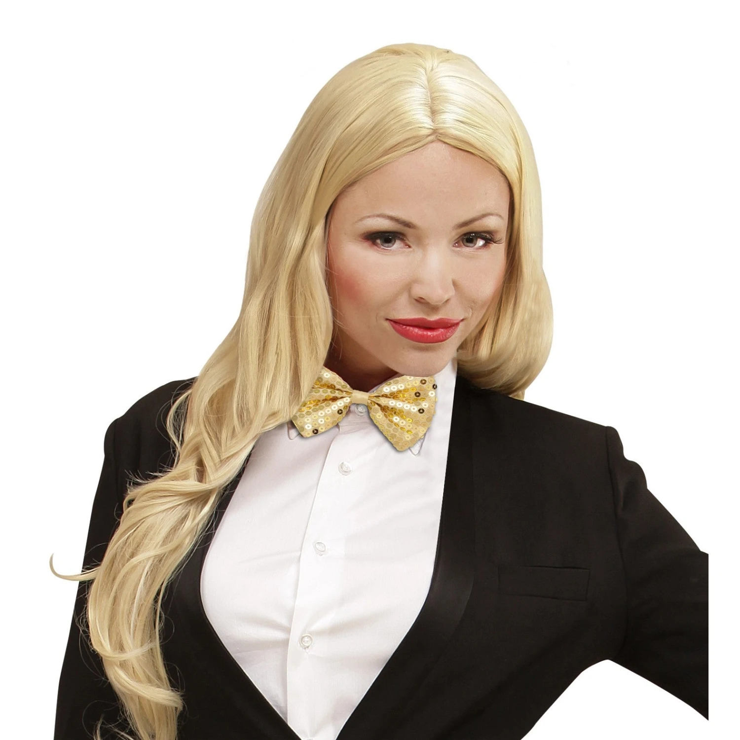 Papillon in tessuto con paillettes oro; è largo circa 11/12 cm per un’altezza alle duie estremità più alte di cm. 7. Dotato di elastico bianco per essere indossato.