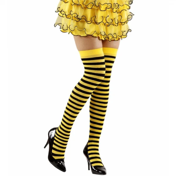 PARIGINE APE ; 70 DENARI. CALZE AUTOREGGENTI A ZEBRATE A RIGHE GIALLE E NERE. UNO SPLENDIDO ACCESSORIO PER IL TUO TRAVESTIMENTO CARNEVALIZIO DA APE… PICCANTE!