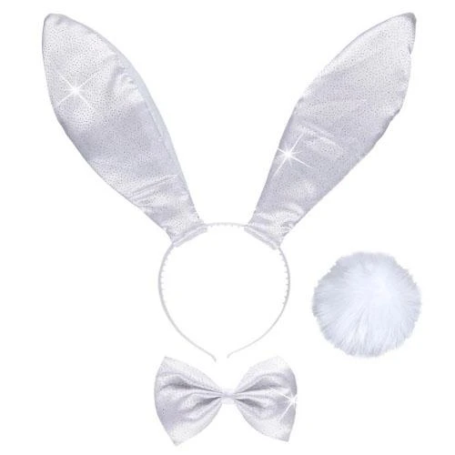 Il set comprende coda a forma di palla con pelo di colore bianco, farfallino con brillante e orecchie paiettate. Tutto il set è rigorosamente in colore bianco. Perfetto per il tuo travestimento di Carnevale. Basterà aggiungero un body e il travestimento sarà completo.