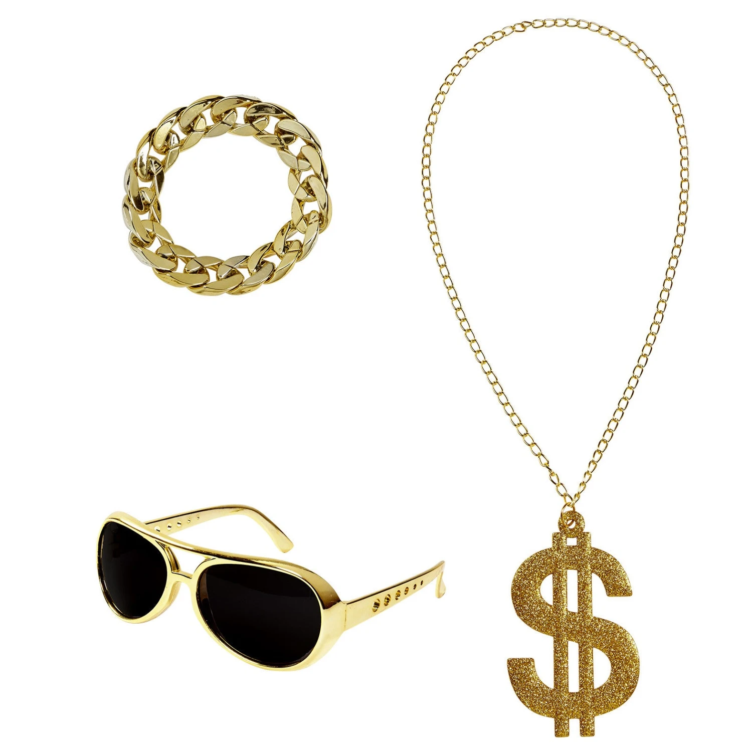Il set che ti proponiamo è da vero coatto e comprende una collana con il simbolo del dollaro, tutto dorato. Un paio di acchiali da solo con protezione uv400. Conclude il set un bracciale in metallo, anche questo di colore dorato. Puoi abbinare questi accessori ad un travestimento per il tuo Carnevale da rapper, o da coatto di periferia…e perchè no, per un travestimento da mafioso!