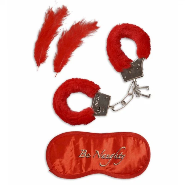 SET COMPOSTO DA ; MANETTE DELL’AMORE IN PELOUCHE, MASCHERINA PER OCCHI IN TESSUTO ROSSO E DUE PIUME ROSSE.
