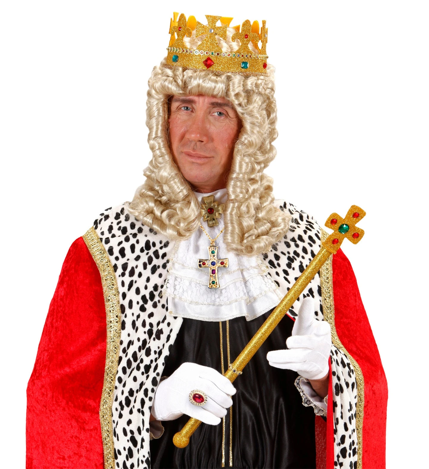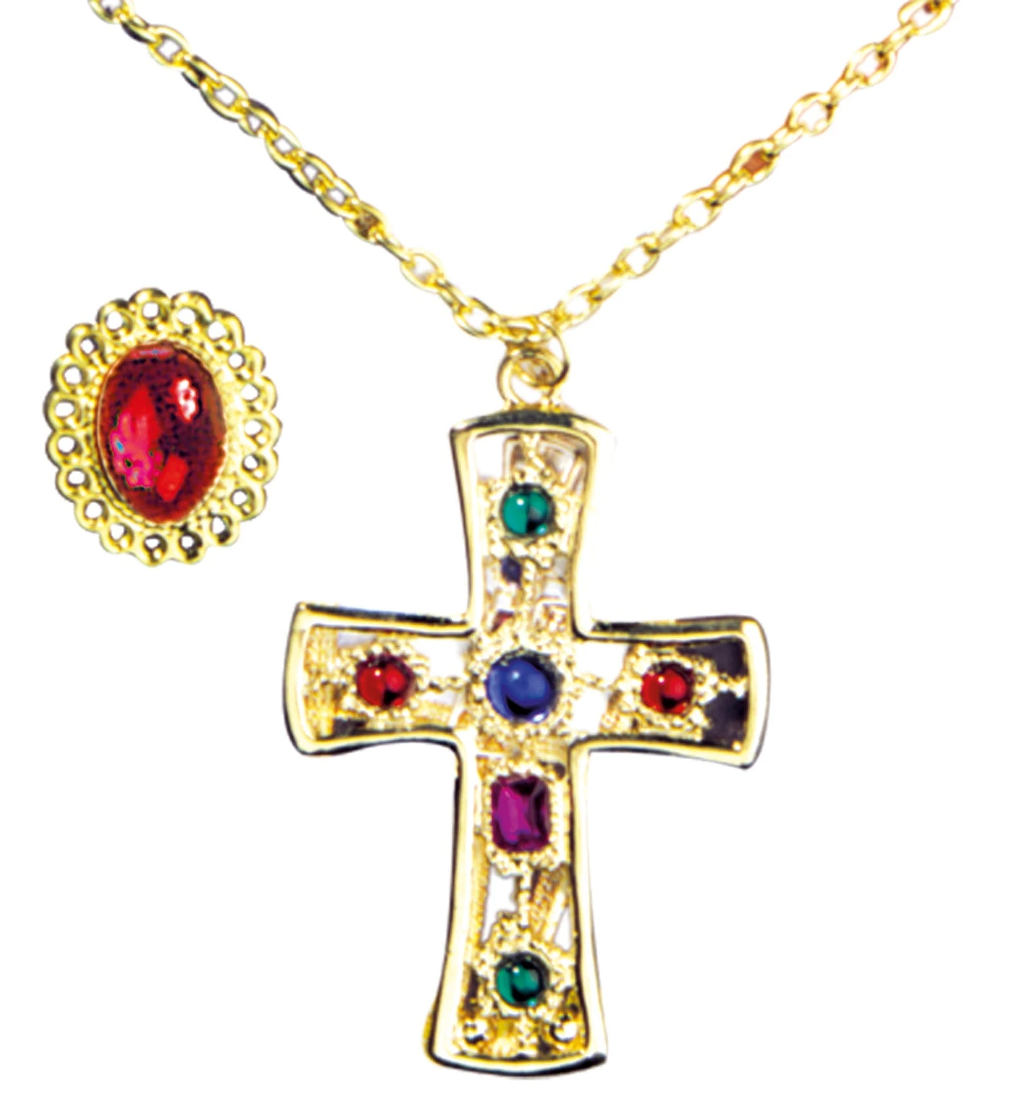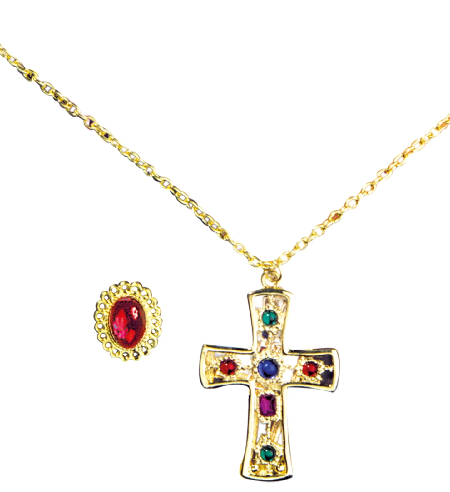 Gioielli reali per re e regina. Il blister è composto da un anello con pietra di colore rosso e collana di metallo dorato che termina con una croce con tante pietre. L’anello ha la possibilità di essere regolato, grazie alla fascia metallica che si trova dietro l’anello stesso. Su Divertilandia.it potrai trovare costumi ed altri accessori, scettro e corona inclusi, per vestire i panni reali.