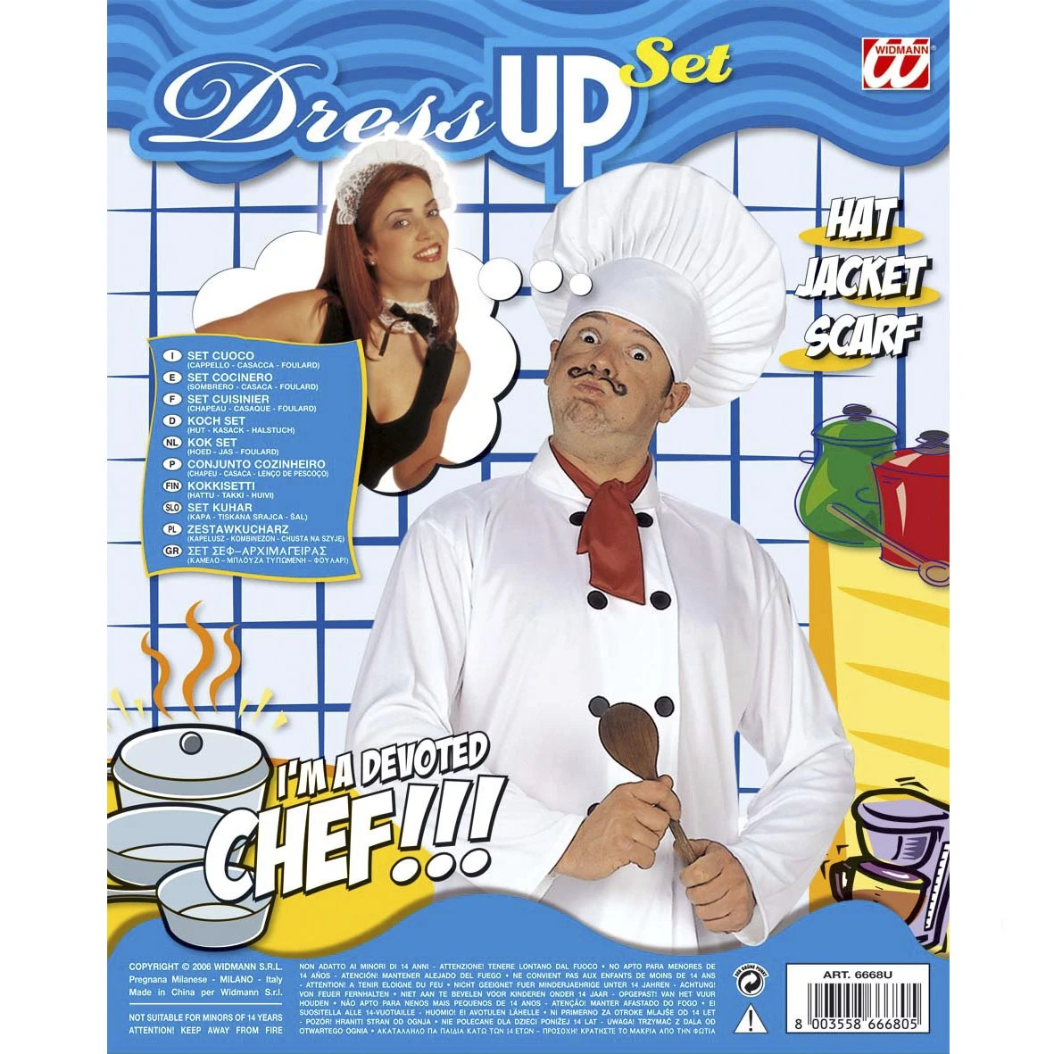 Fantastico set da cuoco, un facile ed economico costume. La confezione comprende il cappello, la casacca e il fazzoletto di colore rosso. Taglia standard m. in misura unica.