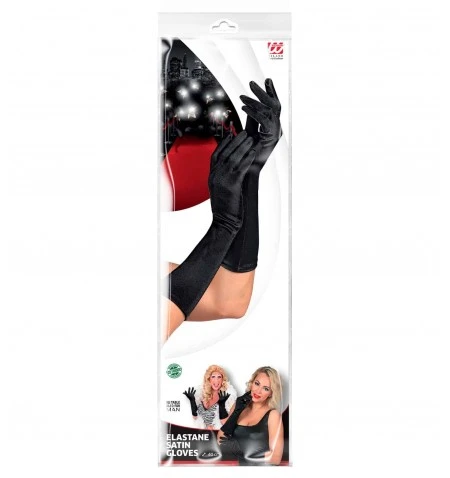 Eleganti guanti in raso nero elasticizzati aderiscono perfettamente al braccio, misurano 40 cm.