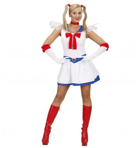 Il costume della famosa eroina manga, in stoffa leggere ben cucita e rifinita. Comprende: vestito con gonna e spalline in tulle, guanti lunghi e girocollo in raso, come da foto. Tg: M.