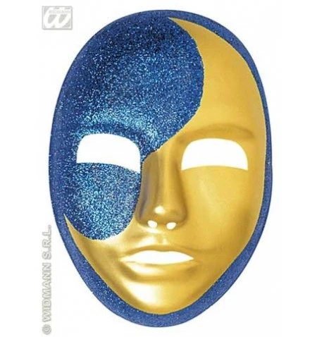 – in offerta – Una maschera in PVC con luna dorata e glitter blu.