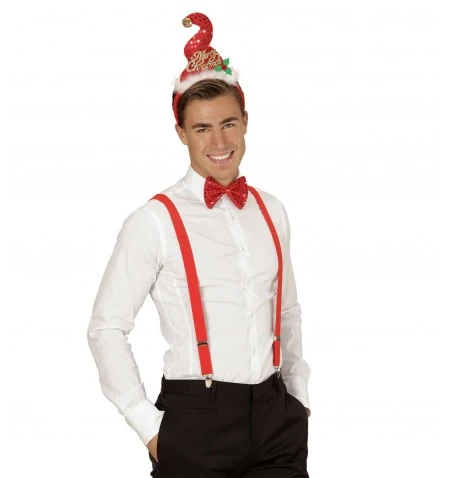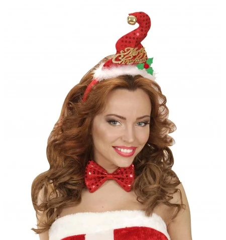 Elegante set natalizio composto da mini cappello e papillon, il tutto ottimamente rifinito con paillettes e piume.