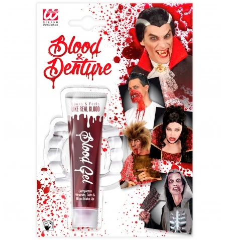 Una confezione di sangue finto in tubetto ideale per make-up e abbigliamento. Include dentiera in plastica. Formato: 30ml.