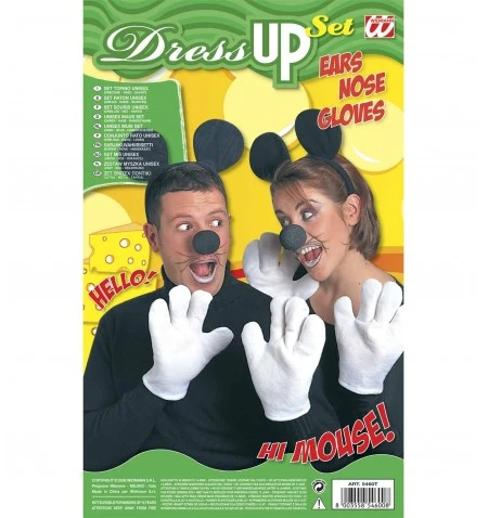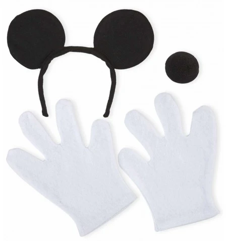 Simpatico set da topino che comprende: cerchietto con orecchie in stoffa, naso in spugna e guantoni in stoffa. Unisex.