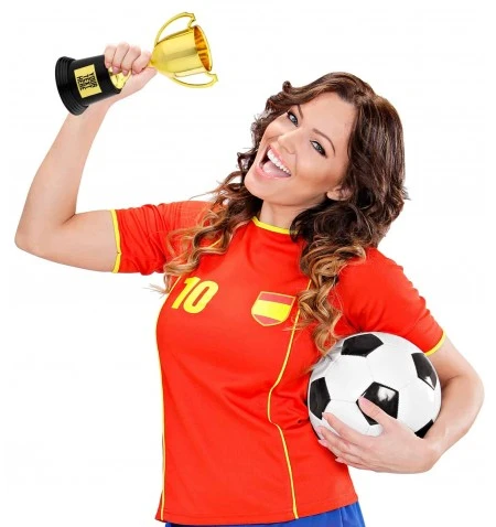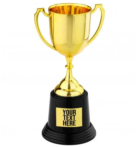 Trofeo in plastica con etichetta adesiva personalizzabile. Misura: 22cm.